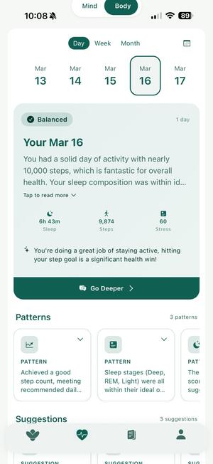 Your daily summary brings sleep, steps, stress, and mood together in one view — with personalised patterns and actionable suggestions.